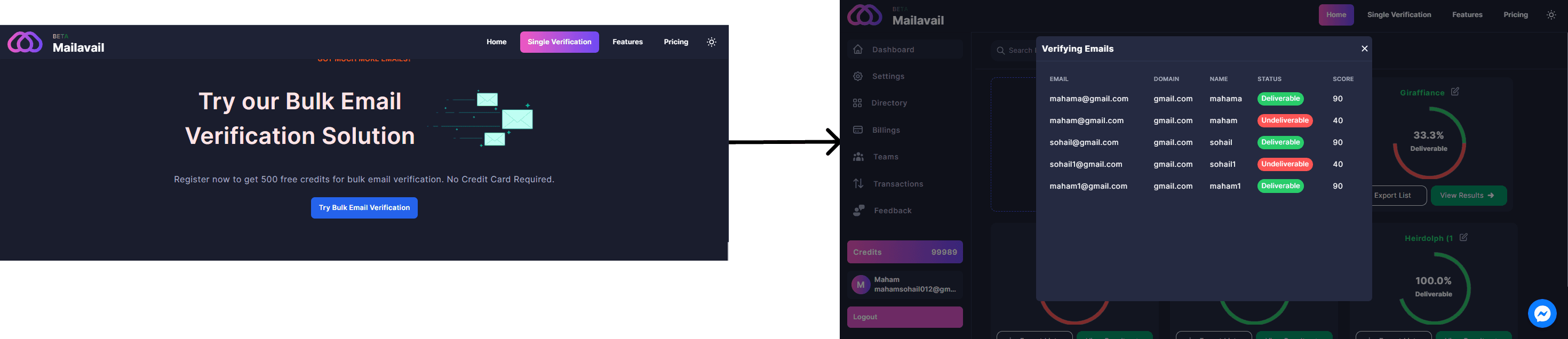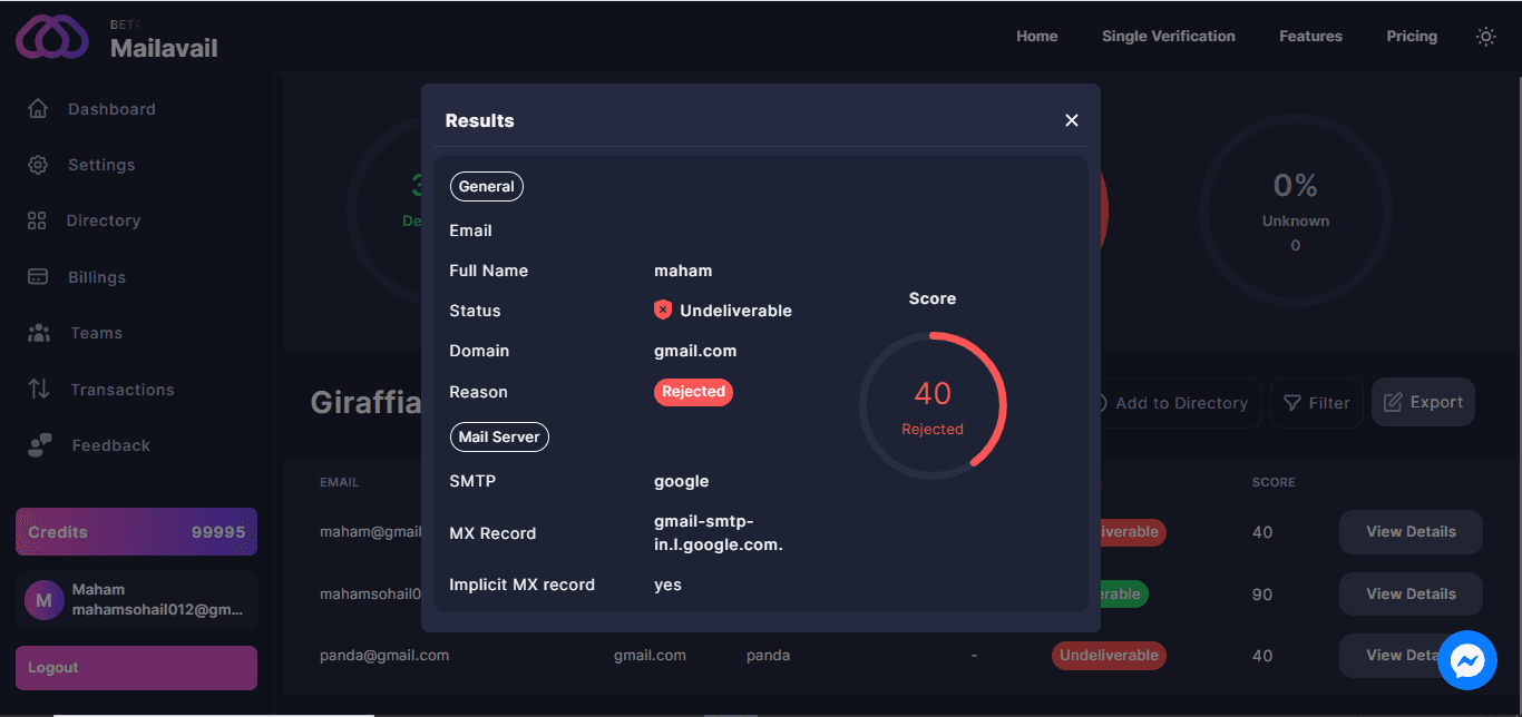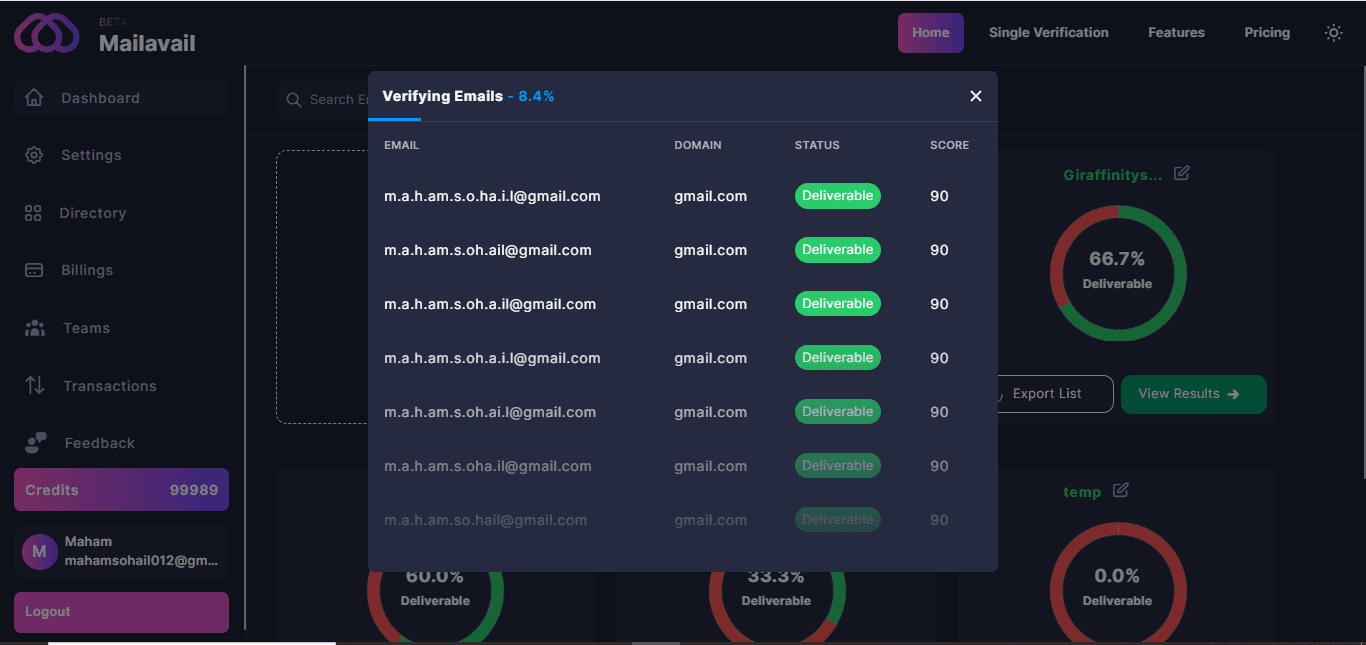 Process your email verification list in real time, Mailavail committed to providing detailed updates on each email's status, including whether it's valid, invalid, or needs further attention. You'll receive comprehensive statistics on progress, helping you optimize your email database effectively.